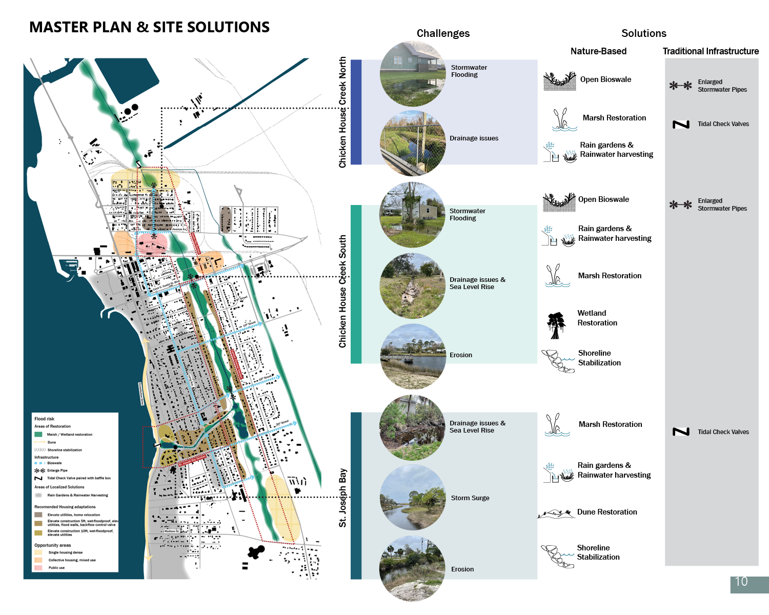 Port St. Joe is a rural coastal community currently facing sea level rise and ongoing flood risk. In 2018 Hurricane Michael hit Port St. Joe as a category five Hurricane. This initiated design and planning work around disaster recovery for long-term sea level rise adaptation planning. The Master Plan focused on city-wide nature-based solutions and traditional infrastructure to address flood risk. Project required geo-spatial analysis of compounding flood risk, site surveying, and collaborative community workshops.