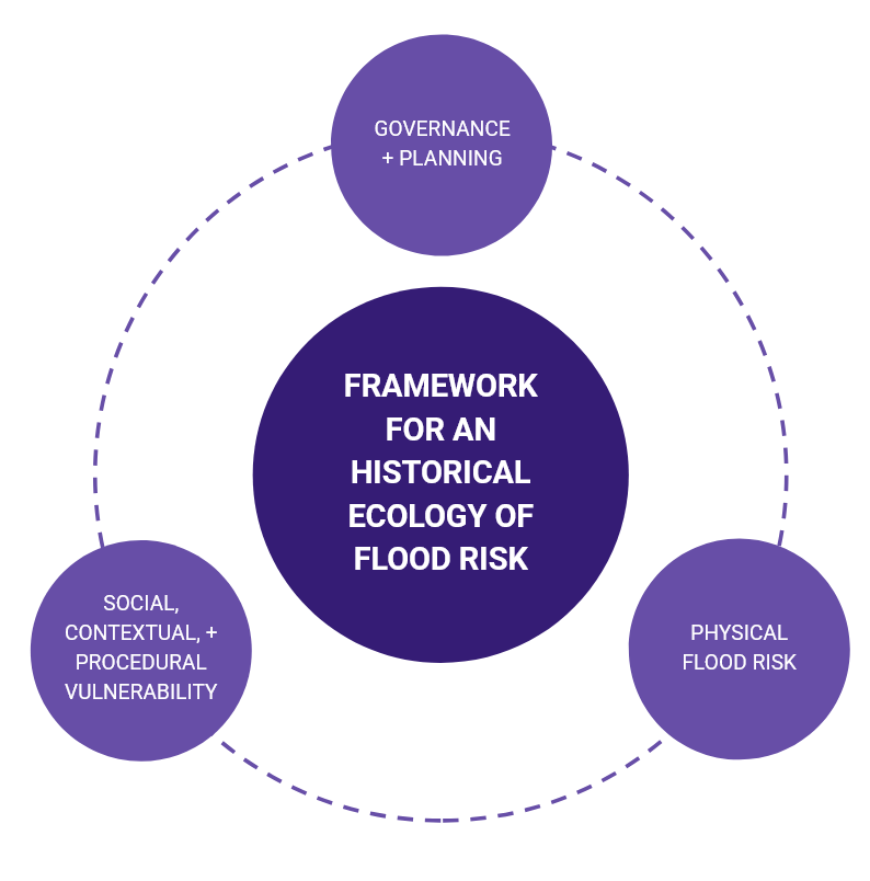 Physical Flood Risk: This encompasses the physical environment of the region, across time, and how it structures flood risk. Here, the physical environment refers to many aspects driving the form of the environment including: topography and topographical changes, changes in regional waterways, and histories of development and changes in development.